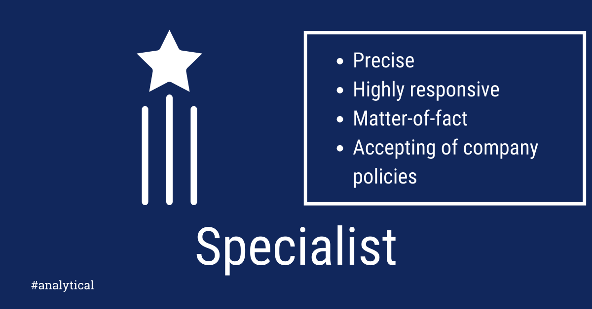 When working with Specialists, remember that they’re reserved, respectful, sincere, and detail-oriented. They’re typically most effective with siloed work that requires exactness and accuracy with details. Specialists are great at doing things right and fast. When managing this profile, consider some of the following suggestions: